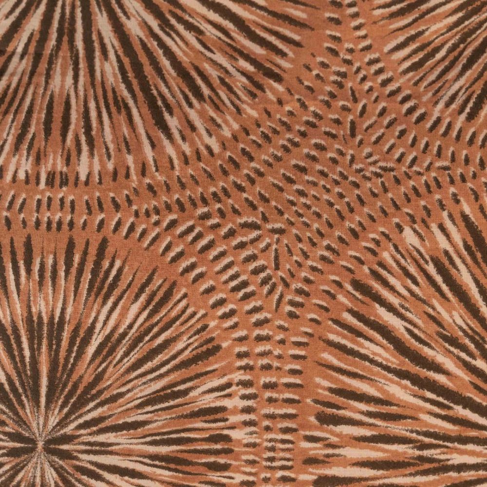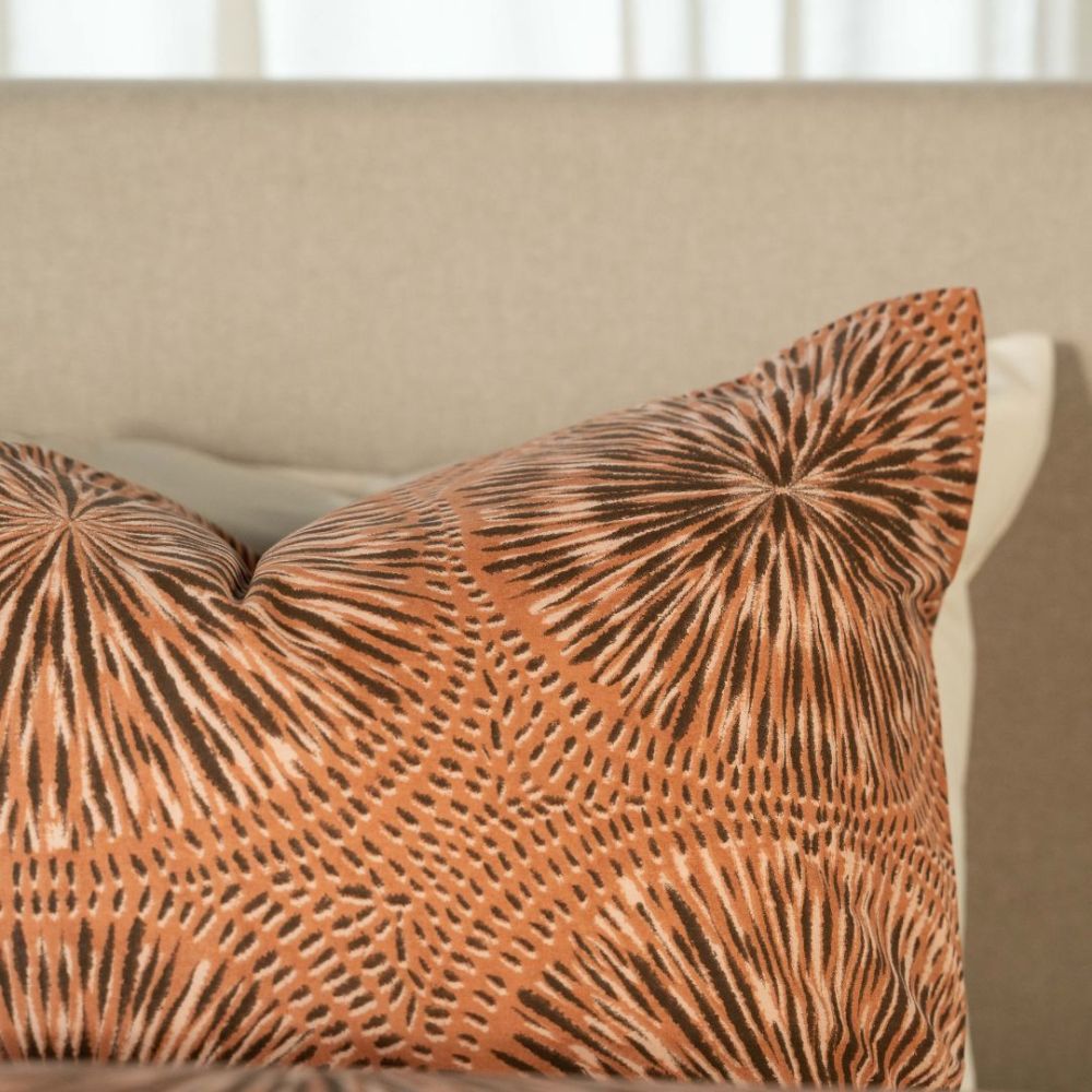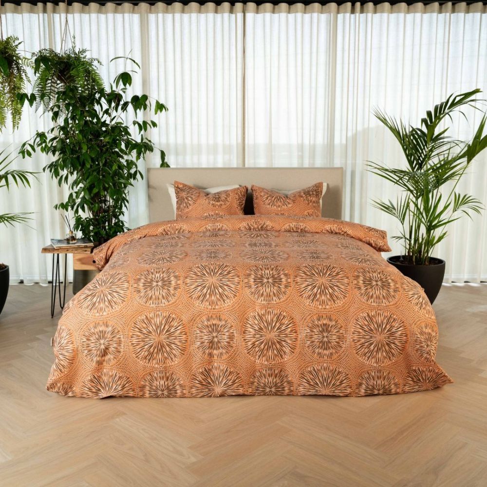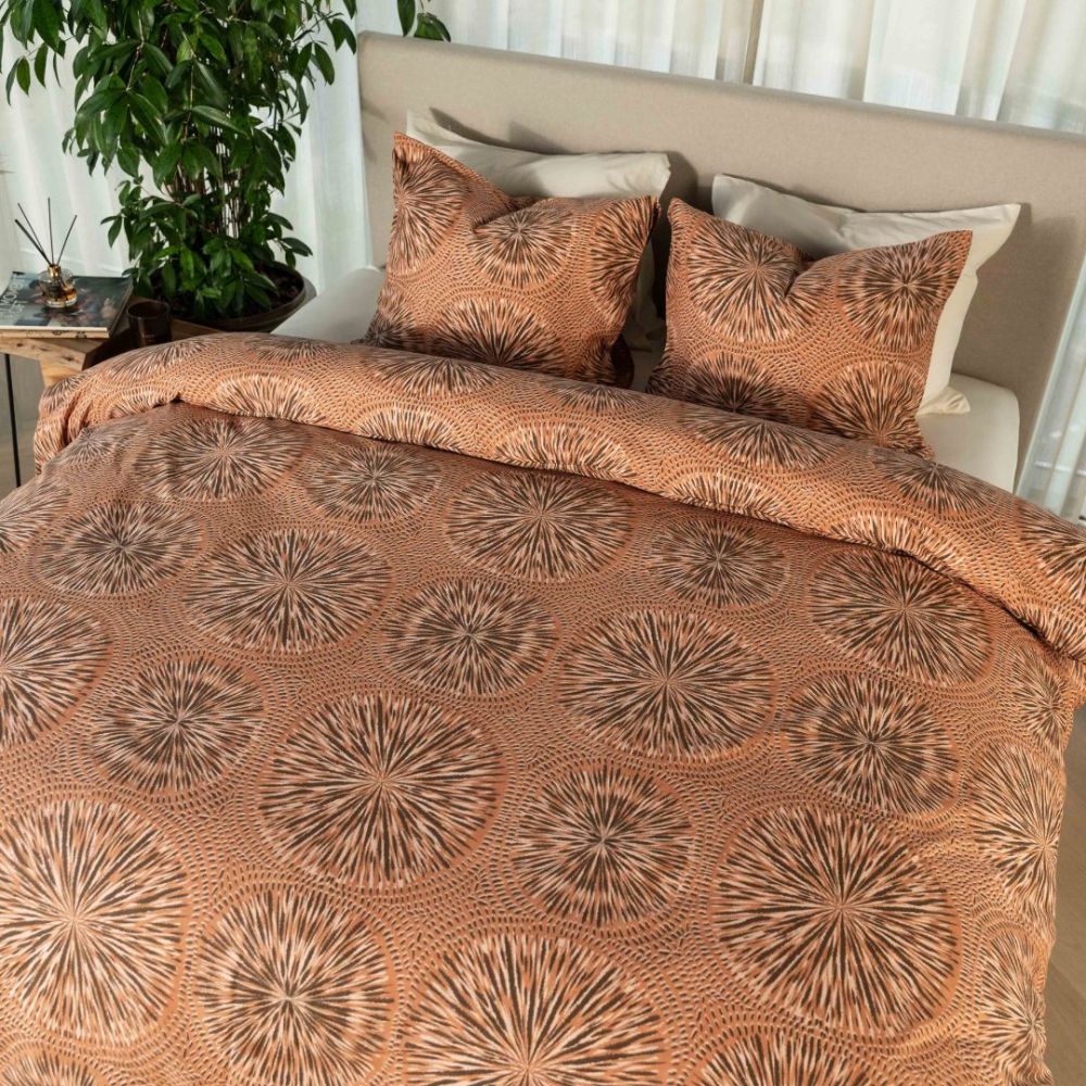 Dit overtrek heeft een rond patroon dat bestaat uit grote cirkels gevuld met fijne, stralende lijntjes. Deze lijnen lijken op kleine zonnetjes of bloemen die van binnen naar buiten uitwaaieren. Tussen de cirkels zitten korte streepjes die het patroon extra diepte geven. De kleuren in dit overtrek bestaat uit een warme terra-achtige tint, een mix van oranje, roestbruin en abrikoos. De lijnen in de cirkels zijn donkerbruin en gebroken wit, waardoor het patroon duidelijk afsteekt tegen de warme achtergrond.